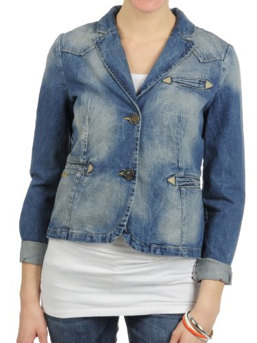Blazer en jean élégant de Tigerhill, Petit col, effet usé délavé, Encolure en V, se ferme par deux boutons, Coutures décoratives branchées, Coupe cintrée