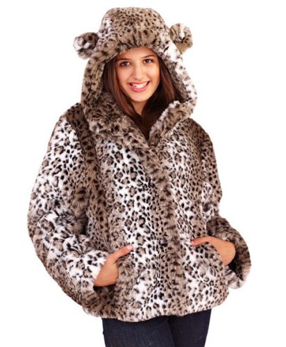 veste femme en fausse fourrure impression peau de bête, capuche avec oreilles, doublure et poches