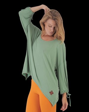 Ce tee-shirt femme pour le yoga est composé de manches 3/4, ajustables grâce à leur lien de serrage. Une coupe originale ample avec une découpe concave sur le bas lui donne un look tendance et différent. De coloris vert, vous l'assortirez aisément avec nos pantalons destinés au yoga. Recommandé pour le yoga, la gymnastique douce ou toute autre activité similaire, vous apprécierez son confort lié au textile innovant en bambou. Vivez votre sport avec un vêtement yoga écologique : vous n'en serez pas déçue.